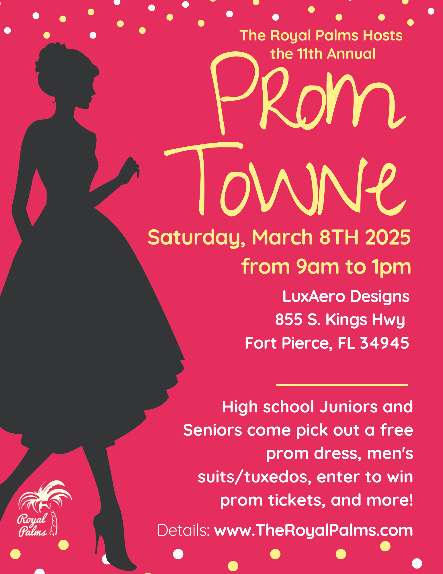 Prom Towne will be held Saturday, March 8th 2025 from 9am to 1pm at LuxAero Designs 855 S. Kings Hwy. Fort Pierce, FL 34945